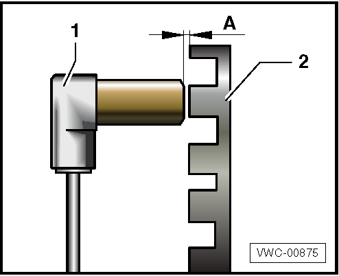O ajuste do posicionamento do sensor (1) em relação à roda dentada (2) ocorrerá automaticamente no primeiro movimento da roda, porém não poderá ultrapassar a 0,6 mm, indicado pela letra A da ilustração.